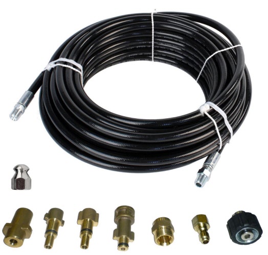 Sewer Jetter Kit - 100' x 1/4 Hose & Nozzle. This kit works best on 2" to 4" Pipes. Assortment of fittings will allow sewer kit to work with most gas and electric pressure washers